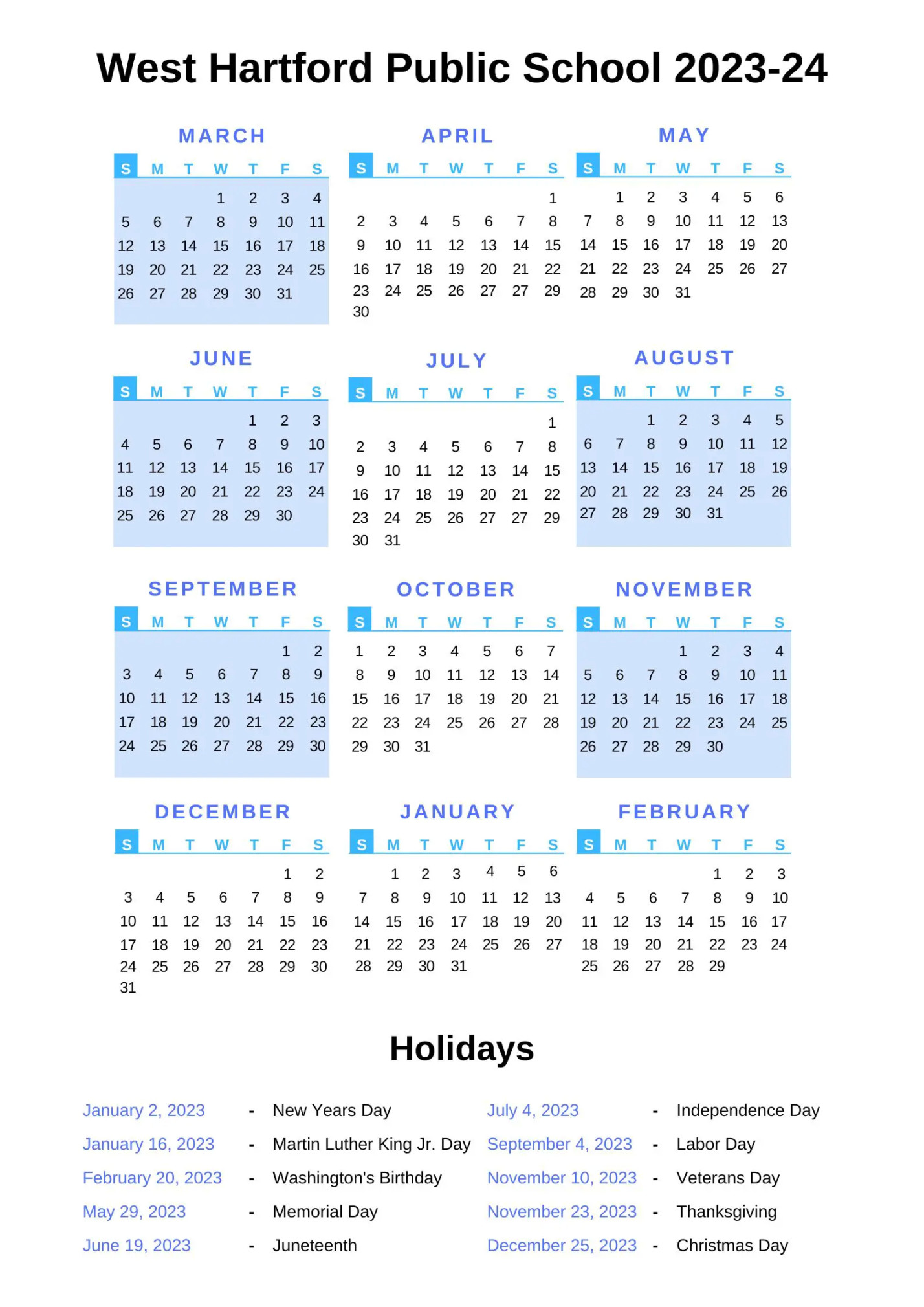 West Hartford Public Schools Calendar